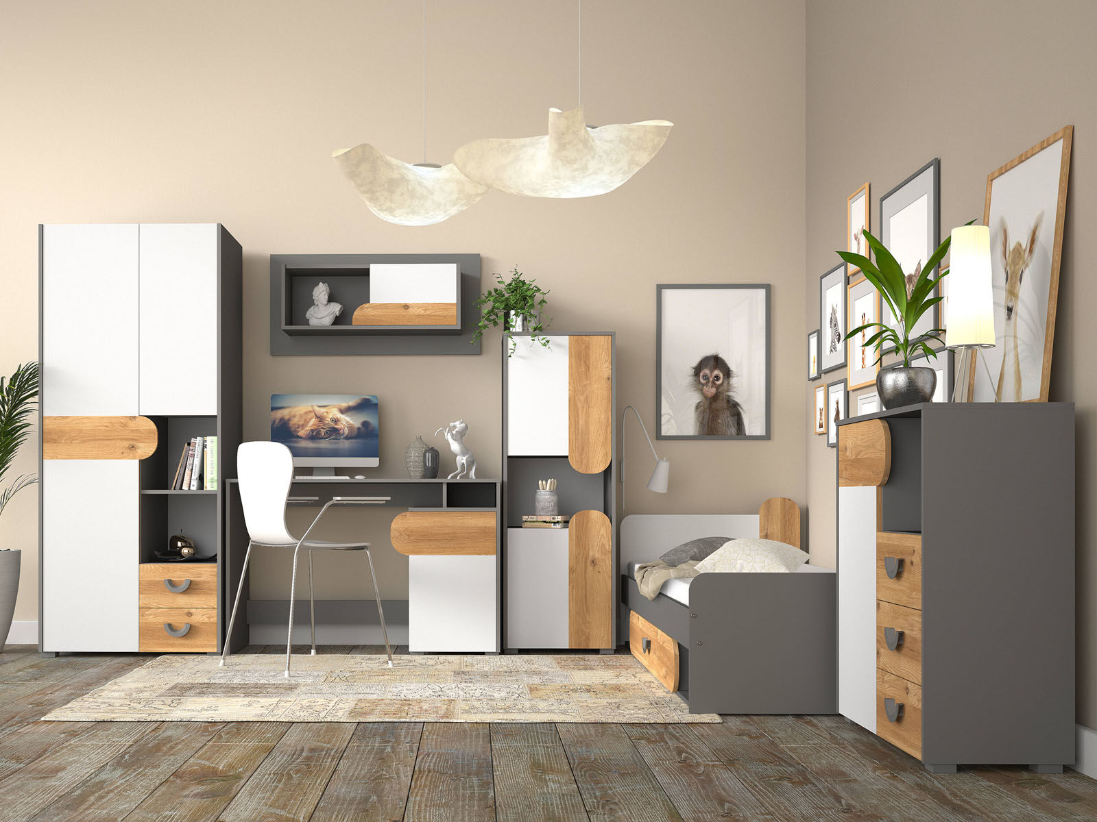 Kledingkast CARINO zal zonder problemen een plaatsje vinden in de tienerkamer! Met de kleurenmix van grafiet, bruin en wit, zorgt deze kast voor een robuuste en trendy look in de ruimte. Ook aan opbergruimte absoluut geen gebrek! De kast is namelijk voorzien van een garderobestang, 2 lades en enkele open nissen. Het meubel is gemaakt van kwalitatieve spaanplaat en staat op stevige poten. Helemaal verliefd geworden op kast CARINO? Neem dan zeker eens een kijkje naar de andere meubelen uit collectie CARINO!