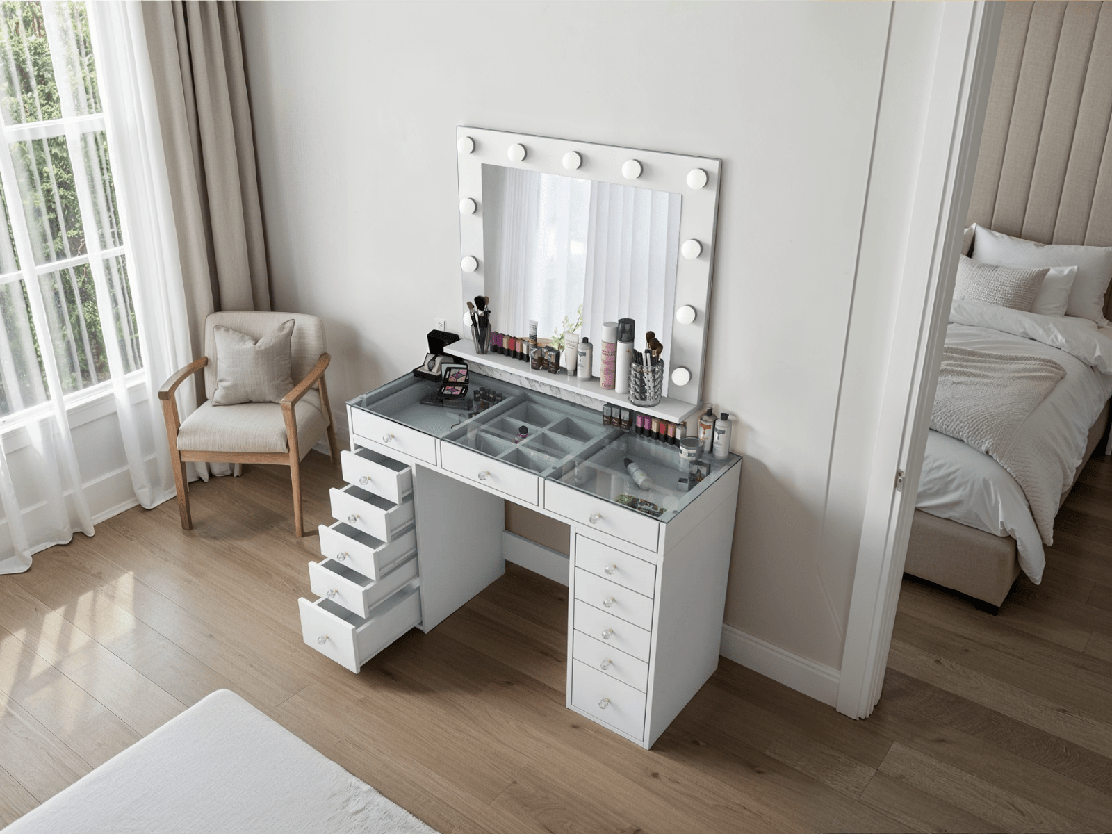 De make-uptafel JESSIE DELUXE combineert een compact formaat met luxe details. Het ruime tafelblad en de 7 lades geven genoeg opbergruimte voor make-up, sieraden en verzorgingsproducten. Dankzij de meegeleverde spiegel heb je meteen alles bij de hand voor je dagelijkse routine.