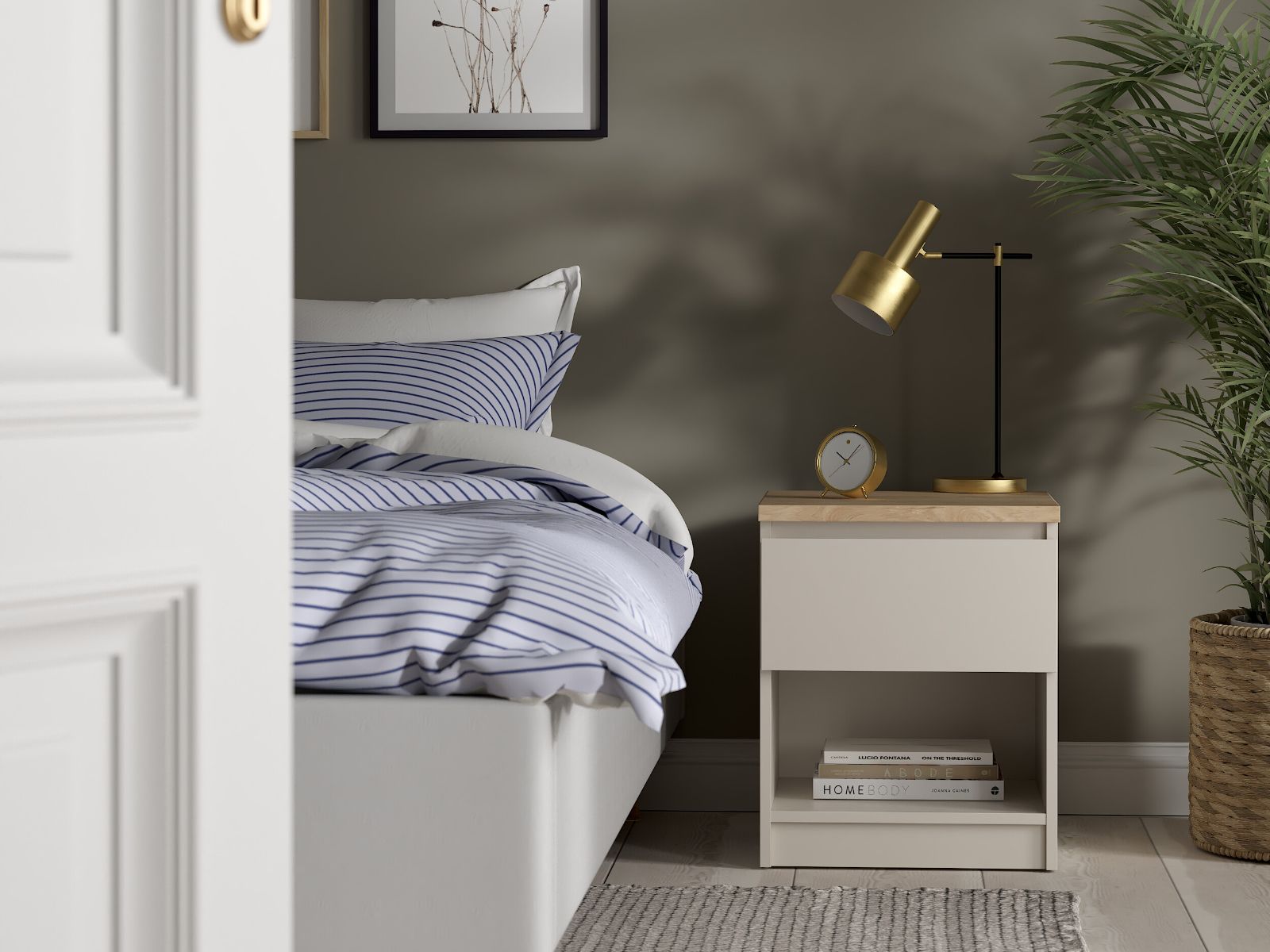 Dankzij het strakke design zonder handgrepen oogt nachtkastje NAIADE modern en verfijnd. De elegante kasjmier kleur in combinatie met het warme jackson eik bovenblad, zorgt voor een tijdloze en trendy uitstraling. Perfect om je slaapkamer een frisse, stijlvolle touch te geven!