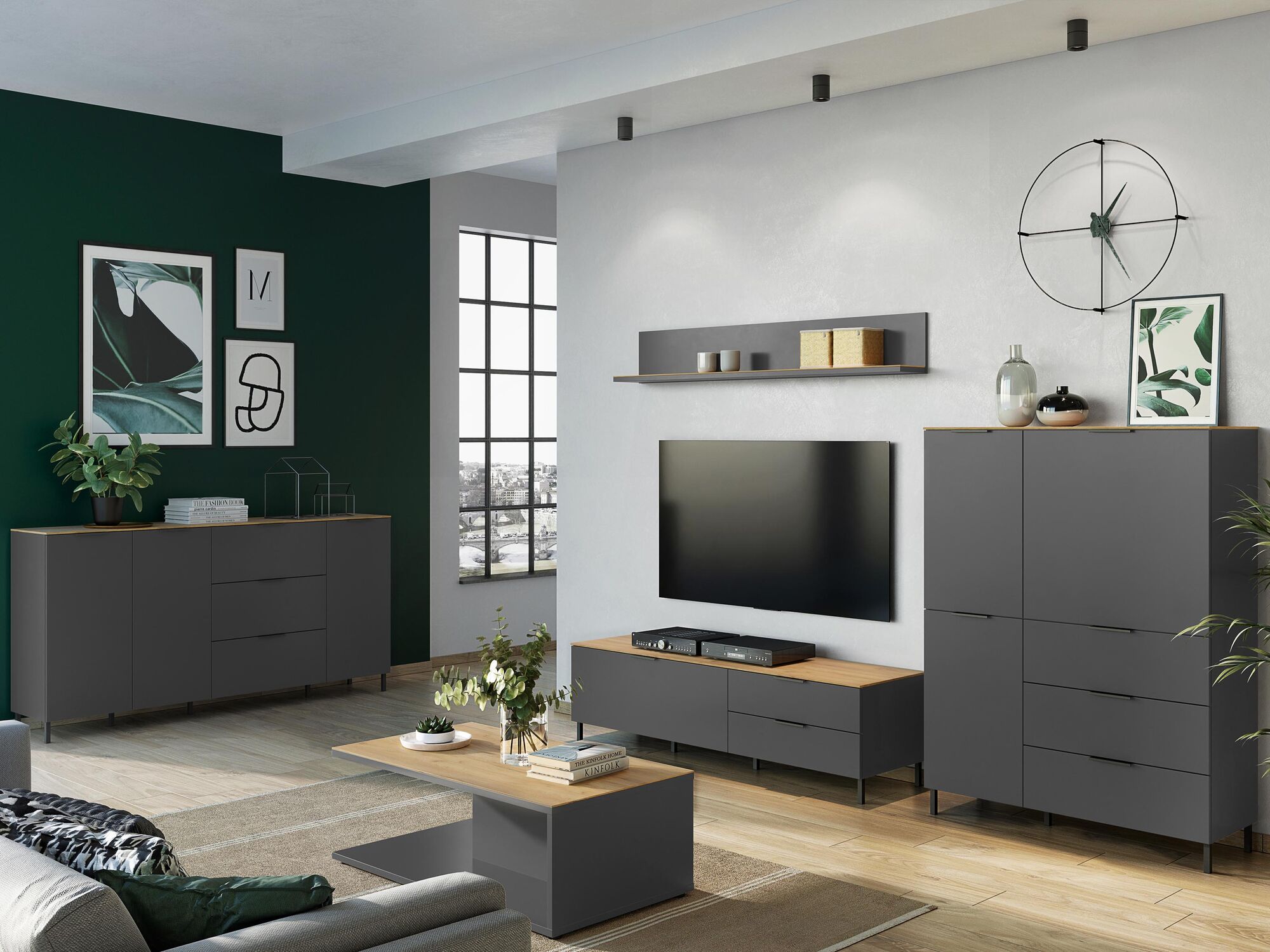 Breng een vleugje originaliteit in jouw zithoek of woonkamer met moderne opbergkast CALIFA! Het gebruik van grafietgrijs in combinatie met de bruine eikenkleur zorgt echt voor een unieke en leuke look. De opbergkast is voorzien van verschillende legplanken en lades zodat je zonder problemen al jouw spulletjes kan opbergen. Zowel de deuren als de lades zijn voorzien van een softclose systeem. De structuur van het meubel is van spaanplaat, afgewerkt met een melamine coating. De zwarte handgrepen zijn van metaal. Combineer opbergkast CALIFA met tv-meubel CALIFA en geniet van een uniek én trendy geheel!